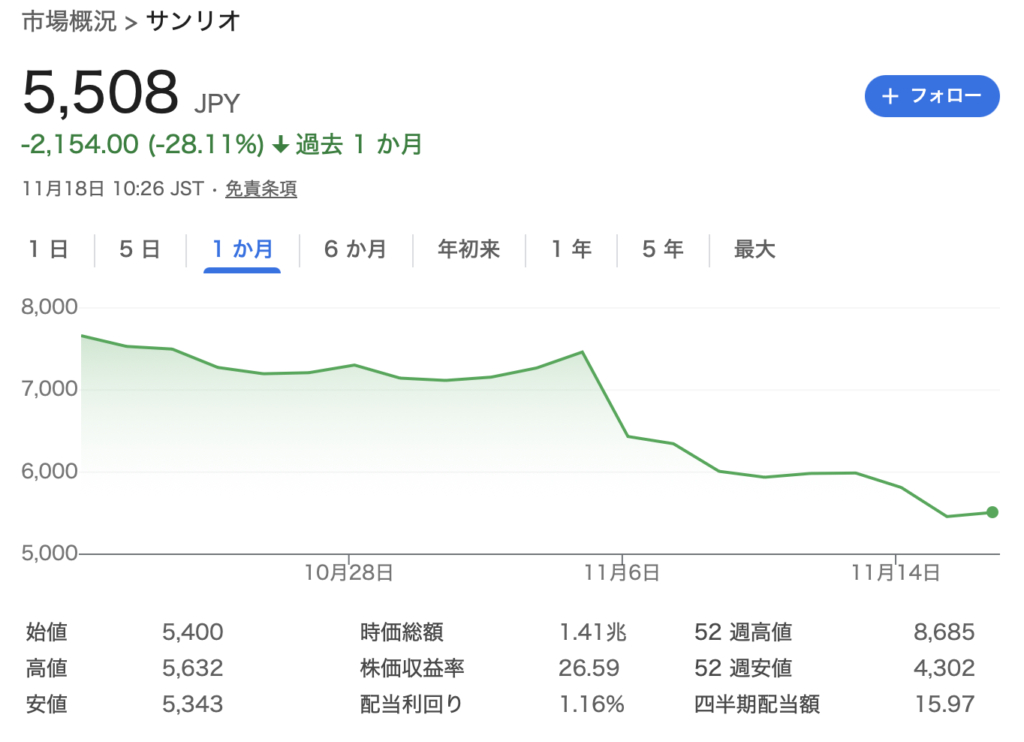 もし投資家が「中国成長が鈍る=海外ライセンス・売上が伸びない」と見ているなら、サンリオも影響を受ける可能性があります。例えば、中国でのキャラクター人気低迷/ライセンス契約・コラボ減少/中国経済の景況感低下などです。