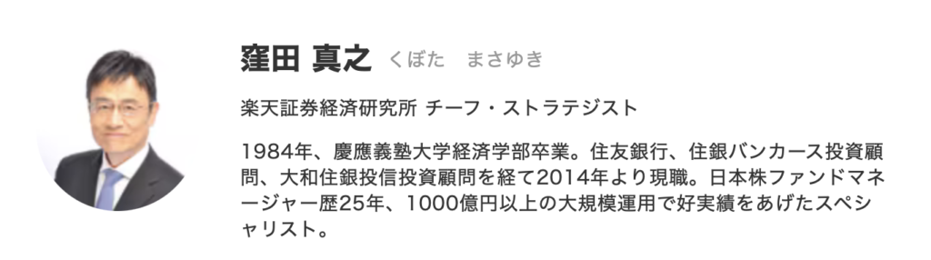 この方は、楽天証券経済研究所のチーフ・ストラテジストをされている方で説明が非常にわかりやすいです。株価の過熱感の説明を過去の実例やチャートなどを利用して、丁寧に解説されたり、「根拠」に基づく発言をされています。