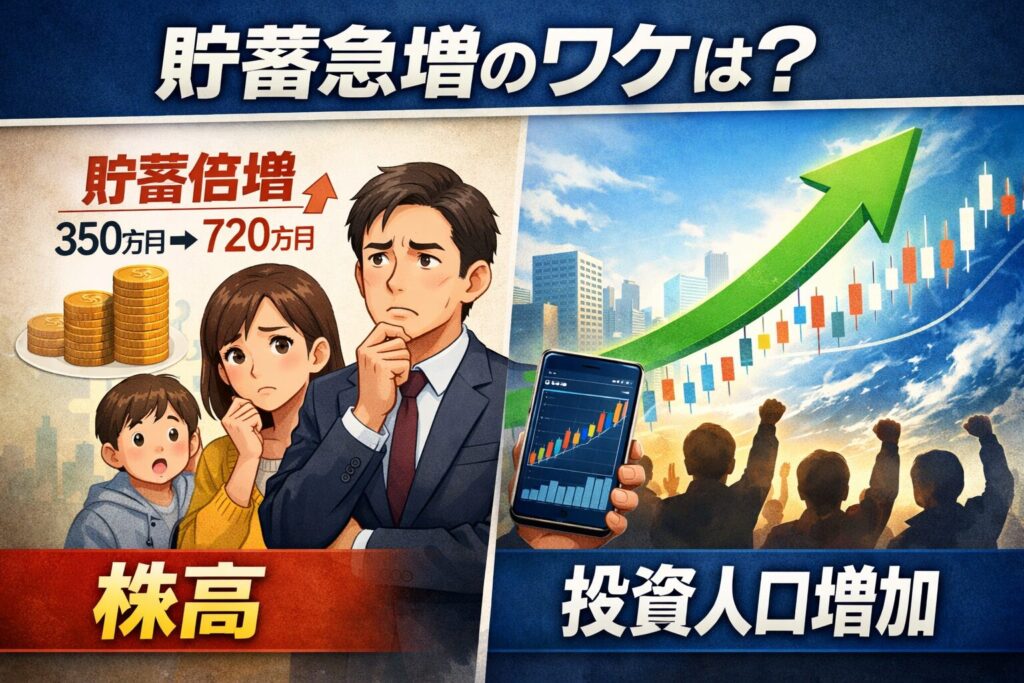 2024→2025の家計調査で「貯蓄が倍増した」と話題になったが、実態は“平均が倍”というより、二人以上世帯の中央値が350万円→720万円とほぼ倍になった動きが目立つ。給料だけで一年でここまで底上げされるのは現実的ではなく、調査側も「株式・債券価格の上昇で評価額が増えた」影響を示唆している。つまり、貯蓄増の大きな部分は“汗”ではなく“値上がり”だ。さらに新NISAなどで市場参加者が増え、真ん中の層にも資産形成の波が届き始めた可能性がある。ただしインターネット調査で毎年同じ世帯を追う形式ではないため、サンプルのブレや相続・退職金などの要因も混ざる点には注意が必要だ。