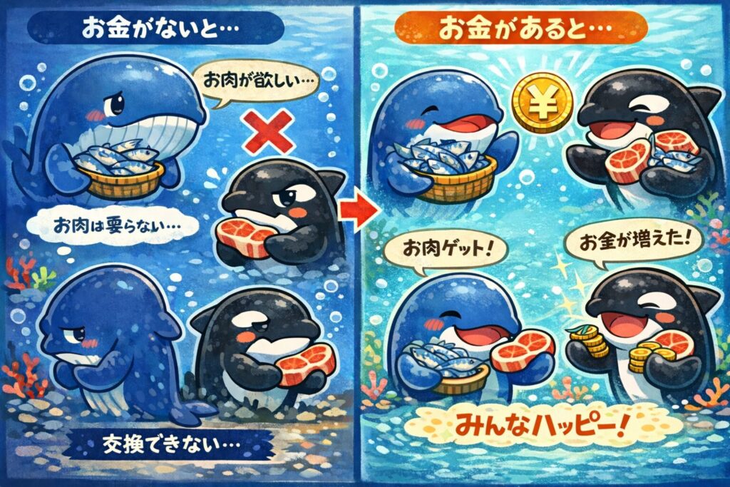 お肉が食べたいクジラにとっては、どんだけ魚を持っていても魚嫌いなシャチはお肉を交換してくれません。そこで、「交換の約束チケット」としてお金が役に立ちます。
